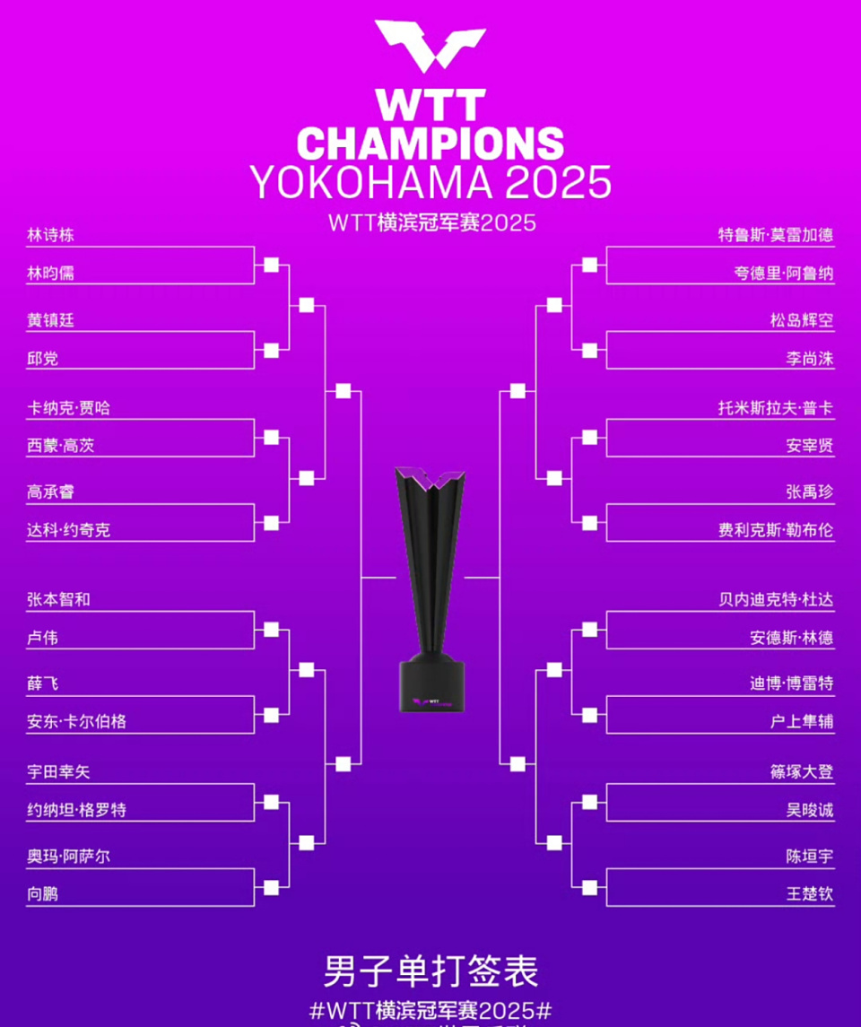 横滨冠军赛林诗栋硬签,王楚钦陈垣宇首轮内战,向鹏张本智和同区